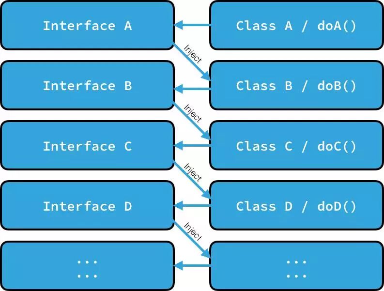 而現(xiàn)在,我們還是在用這種方式,只不錯我們給一個類都添加了界面/執(zhí)行,然后將其注入下一個層面,因為我們現(xiàn)在有了SOLID。